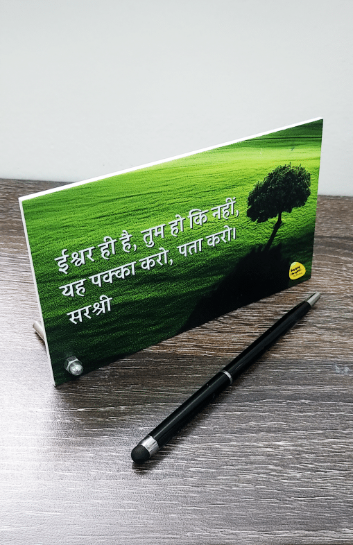 Bring positivity and depth to your workspace or home with this elegant motivational table frame featuring an inspiring quote by Sirshree — “ईश्वर ही है। तुम हो कि नहीं, यह पक्का करो, यह पता करो।”
